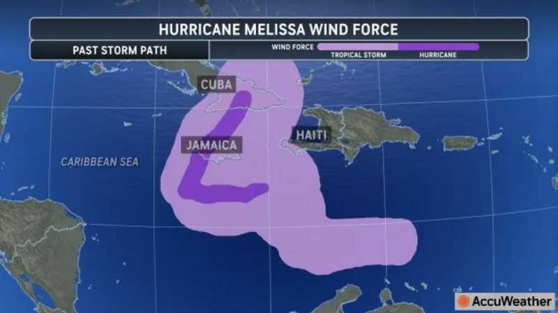Het pad van de orkaan Melissa, dinsdag: Jamaica, woensdag: Cuba | foto: accuweather.com