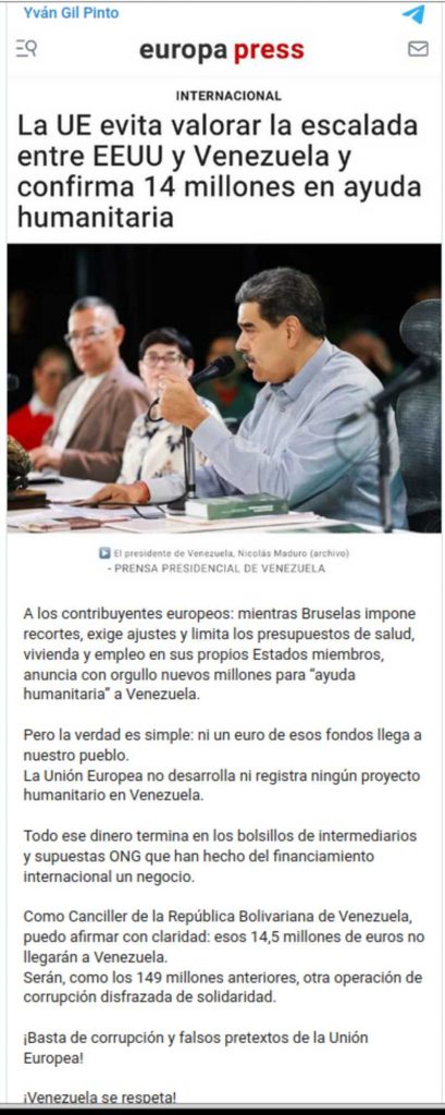 De beschuldiging richt zich op een recente aankondiging van de EU over een toewijzing van 14,5 miljoen euro. Gil verklaarde nadrukkelijk: “Als minister van Buitenlandse Zaken van de Bolivariaanse Republiek Venezuela kan ik duidelijk stellen: die 14,5 miljoen euro zullen Venezuela niet bereiken. Ze zullen, net als de vorige 149 miljoen euro, weer een corruptieoperatie zijn.”