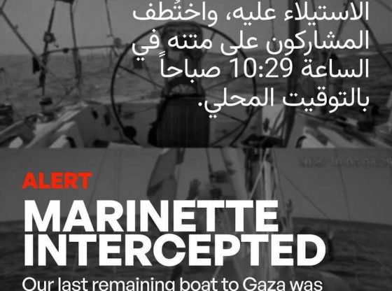 Bron: GSF Telegram ch. 3 oktober 2025 ~~~ Marinette, het laatste overgebleven schip van de Global Sumud Flotilla, werd vandaag om 10:29 uur lokale tijd onderschept, ongeveer 42,5 zeemijl van Gaza.
